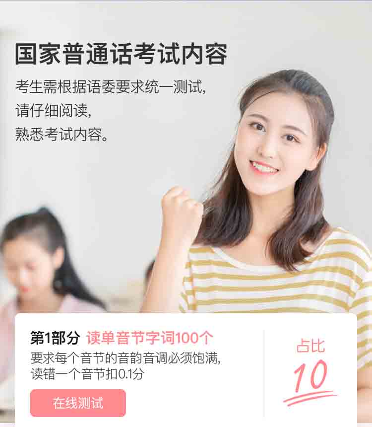 全国普通话考试同一套测评系统,模拟普通话测试考场、即时出分、测评报告纠正发音弱点,帮助您提前适应考试,测出真水平